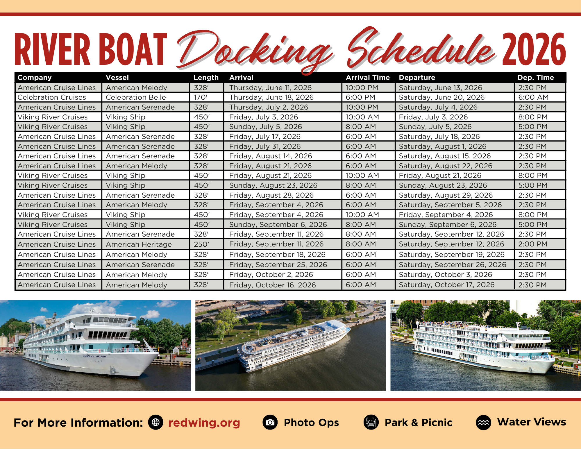 The mighty Mississippi river is calling. Whether you’re navigating the waters in your own pleasure craft or embarking on a luxury cruise, Red Wing is a must-see destination. With phenomenal views all year round, our riverfront offers a unique vantage point of the Mississippi’s natural beauty. From July through October, the river comes alive with massive riverboat vessels. Take a stroll through Levee Park to see these magnificent ships docked for their overnight stays—a sight that truly captures the spirit of river travel. –Ready to experience the river in style? To book your luxury travel experience, please contact the cruise lines directly via their websites or phone to make your arrangements.